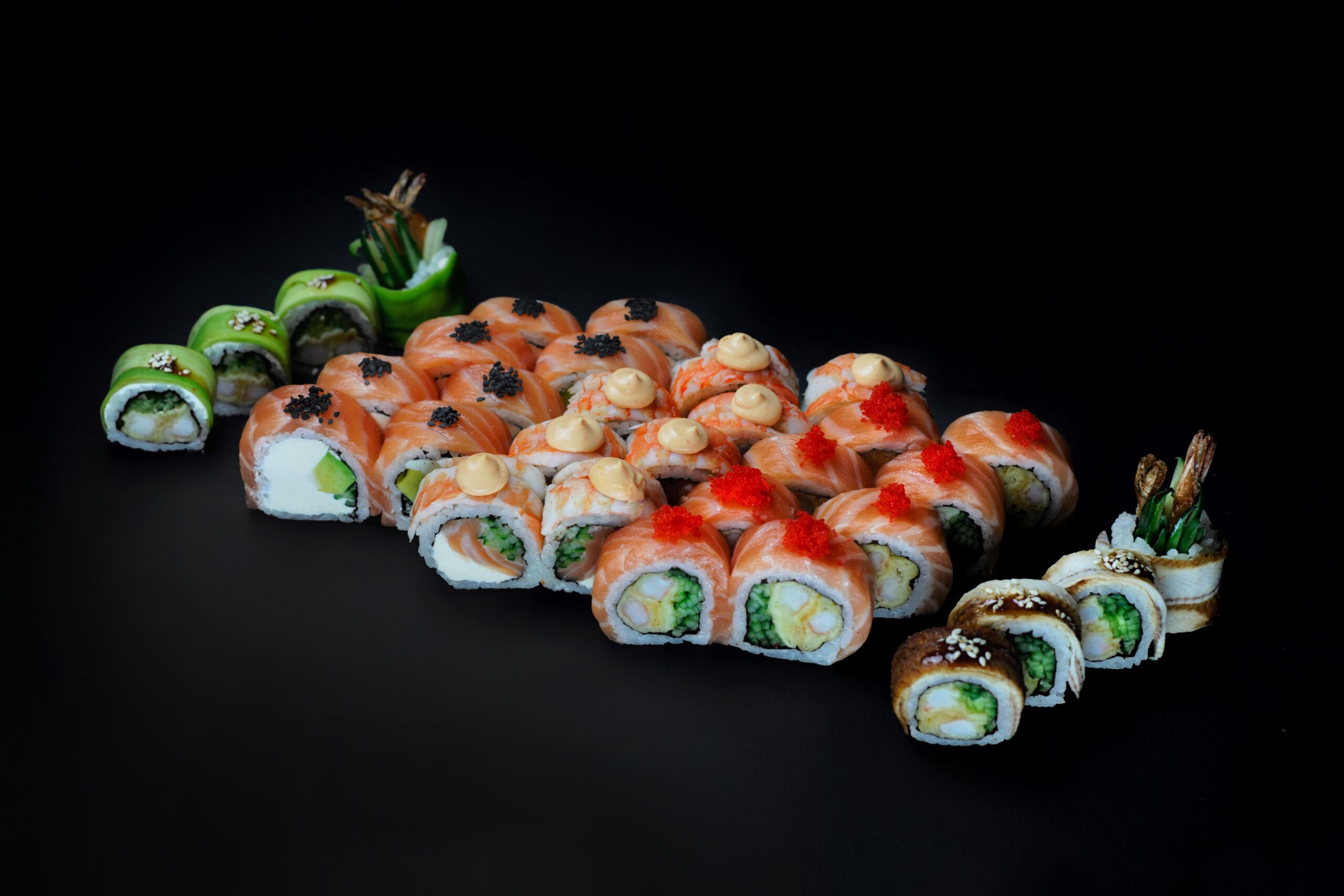 8x california z krewetką w tempurze, ogórkiem i majonezem na ostro owinięta łososiem, tuńczykiem, węgorzem i krewetką, 8x california z krewetką w tempurze, majonezem na ostro, ogórkiem, sezamem i tobiko, 6x futomaki z tuńczykiem, majonezem na ostro, awokado, ogórkiem i sałatą, 6x futomaki z krabem śnieżnym, kampio i ogórkiem, 6x futomaki z krewetką w tempurze, ogórkiem, sałatą i majonezem na ostro, 8x maki z krabem śnieżnym